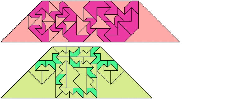 Theoretically, scaled pentabolo 24 and any other scaled pentabolo can together tile an isosceles trapezium. I do not have tilings for all such pairs of scaled pentaboloes.