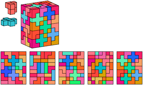 Can a rectangular prism, or box, with odd volume, be filled with copies of a pentacube? For each pentacube, here is the smallest known odd box that it can fill. Torsten Sillke's polycube box tiling page identifies many boxes besides the smallest that can be tiled by polycubes. Toshihiro Shirakawa's Box Packing Collection has extensive box tiling data for polycubes, edge-polycubes, and polyhypercubes.
