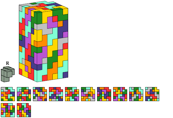 Each of the solutions shown for pentacubes T, A, Z, and M are formed by joining two rectangular box tilings. Smaller solutions may exist for these pentacubes.