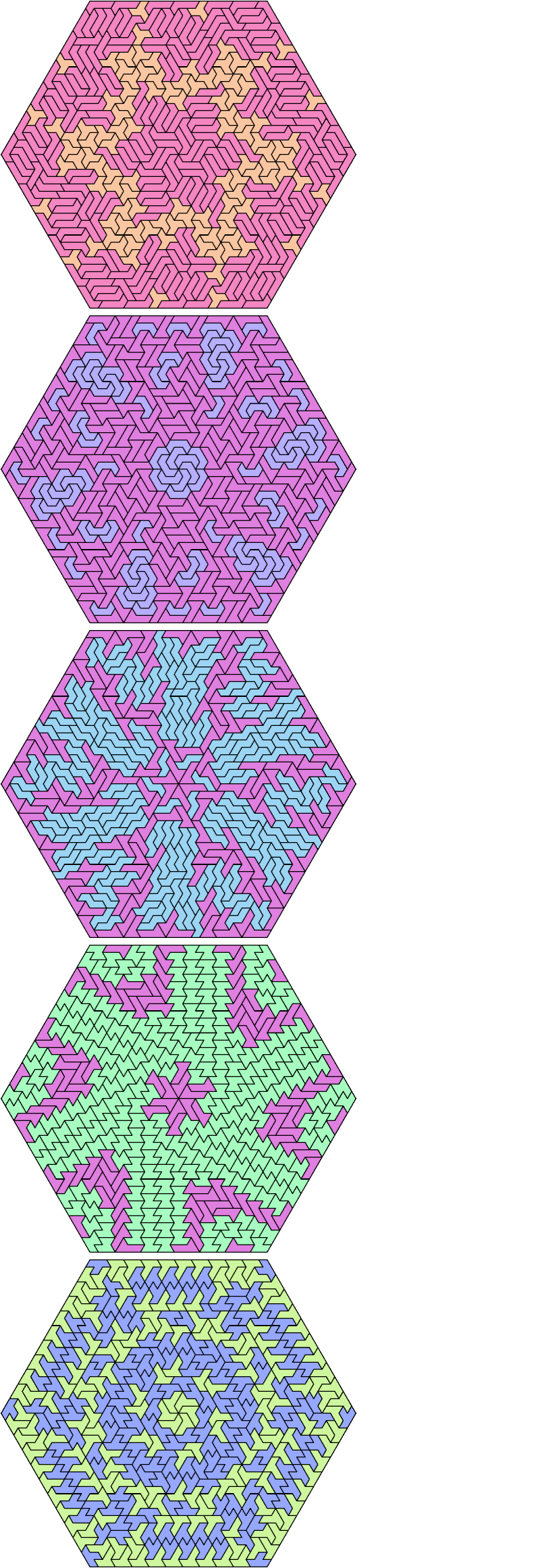 Here I show the smallest known badges that can be tiled by copies of two heptiamonds, using at least one of each. If you find a smaller solution, please write.