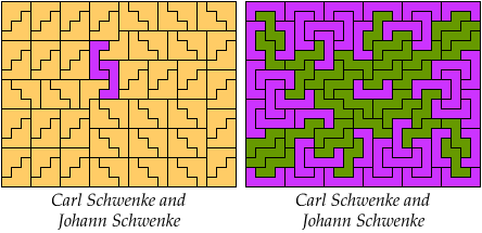 Mike Reid found the last two tilings. Patrick Hamlyn independently found the solutions with 48 or fewer tiles. Carl Schwenke and Johann Schwenke found improvements, and pointed out that one of my tilings at Andrew Bayly's Blog improved on the tiling that I had here.