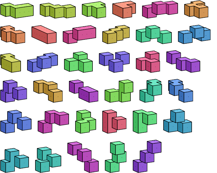 The diagrams below show all two-sided polyquoins with 1, 2, or 3 cells.