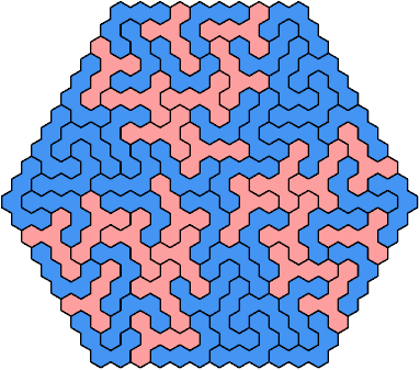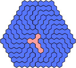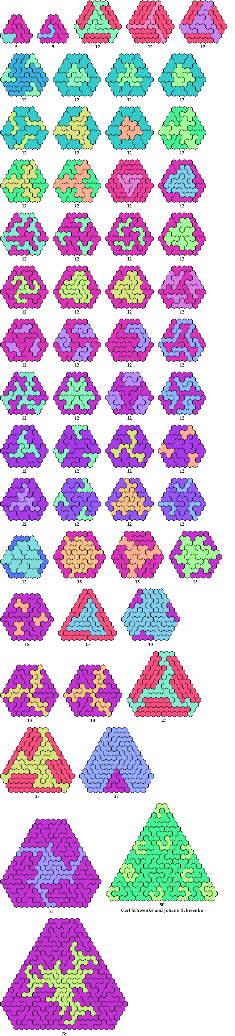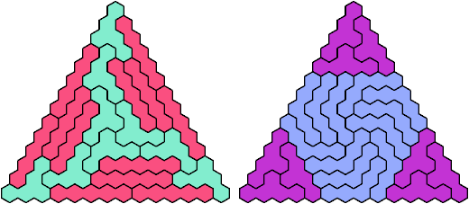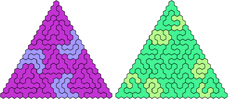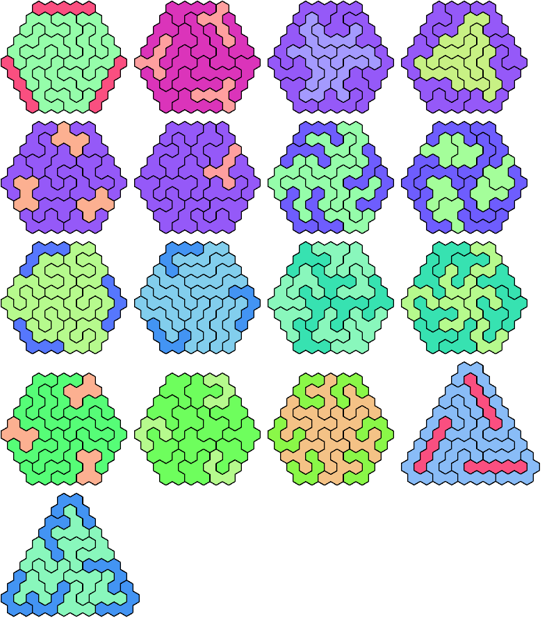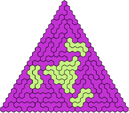 A triangular polyhex is an extreme form of a badge. Many of the solutions below are triangular. See the bottom of the page for non-triangular variants.