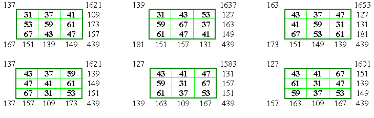The following six heterosquares use the 9 consecutive primes from 31 to 67, so the total of these 9 cells is always 439 (a prime).