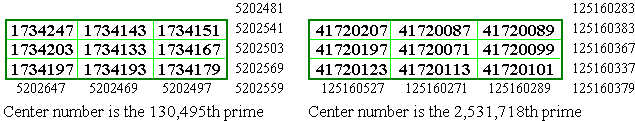 10 ' pr3sq, 16 Apr 2004, Enoch Haga 15 ' nxtprm(x) = get next prime number after x 16 ' prmdiv(x) = is x prime? 20 Q=Q+2531718:N=41720069 30 A=nxtprm(N) 40 B=nxtprm(A) 50 C=nxtprm(B) 60 D=nxtprm(C) 70 E=nxtprm(D) 80 F=nxtprm(E) 90 G=nxtprm(F) 100 H=nxtprm(G) 110 I=nxtprm(H) 120 J=I+B+C 130 K=H+A+D 140 L=G+F+E 150 M=I+H+G:O=B+A+F:P=C+D+E 160 Y=I+A+E:Z=G+A+C 165 Zz=J+K+L+M+O+P+Y+Z:if Zz=prmdiv(Zz) then stop 170 if J=prmdiv(J) and K=prmdiv(K) and L=prmdiv(L) then V=V+1 180 if M=prmdiv(M) and O=prmdiv(O) and P=prmdiv(P) then V=V+1 190 if Y=prmdiv(Y) and Z=prmdiv(Z) then V=V+1 200 if V<3 then 260 210 if V=3 then print I;B;C;J 220 if V=3 then print H;A;D;K 230 if V=3 then print G;F;E;L 240 if V=3 then print M;O;P 250 if V=3 then print Y;Z;"Count =";Q:stop 260 A=nxtprm(A) 270 Q=Q+1 280 V=0 290 goto 40