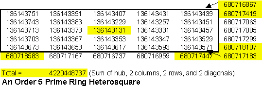 ring heterosquare. It consists of 25 consecutive primes arranged in a