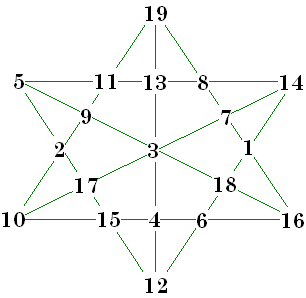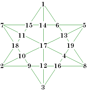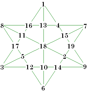 figure [2]. They found that the answer was affirmative. Their algorithm and the resulting computer search program found all possible solutions. There are actually 9 separate magic constants, ranging from 46 to 54. This search problem was made manageable by using several short-cuts.