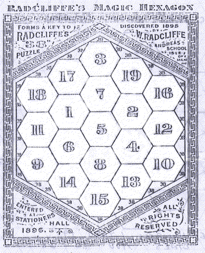 Addendum: Sept. 12, 2002 Jerry Slocum mailed me a copy of an advertisement (?) dated 1896, crediting W. Radcliffe, Isle of Man, U.K. with this discovery in 1895. Jerry Slocum has a large collection of mechanical puzzles. See pictures here of two puzzles based on this magic hexagon as well as puzzles based on magic stars. (Click on this picture for an enlarged view). |
