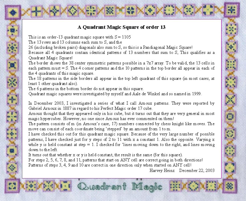 My order -13 Quadrant magic square has 14 patterns correct in all 4 quadrants. |