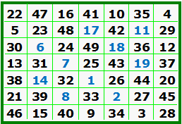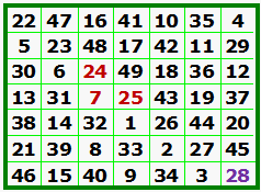 E. This is a number (not magic) square. (Disregard the fainter numbers. They are just inserted to complete the square.) The lake and the 2 ponds together retain 488 units of water. This is the maximum possible for an order-7 number square. [4]