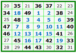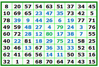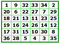 Shows 1 of 36 simple magic squares that hold the maximum of 69 units of water.