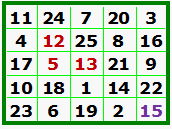 square (not counting rotations and reflections). B. is the algebraic representation of A. Compare x and y with the above table. C. is the order-5 Luo Shu format magic square. Compare colored integers with the above table. |
