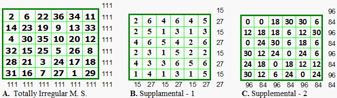 Together, the first 3 magic squares use the consecutive numbers from 1 to 97. The two order-4 squares each use the numbers 10, 11, 21, 22, 32, 33, 43, 44, 54, 55, 65, 66, 76, 77, 87, and 88. The order-9 composite square uses the remaining numbers. |