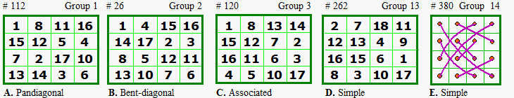 example order-4 squares taken from his index ordered list of 1040 magic squares
