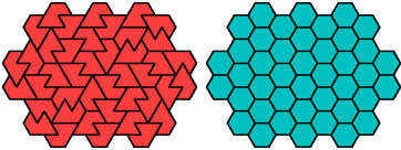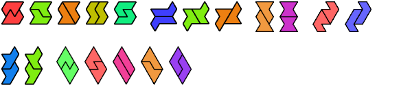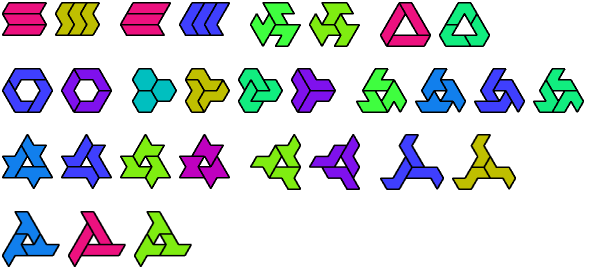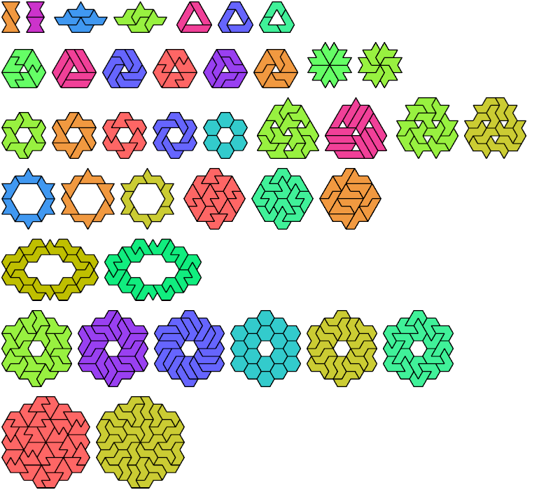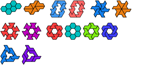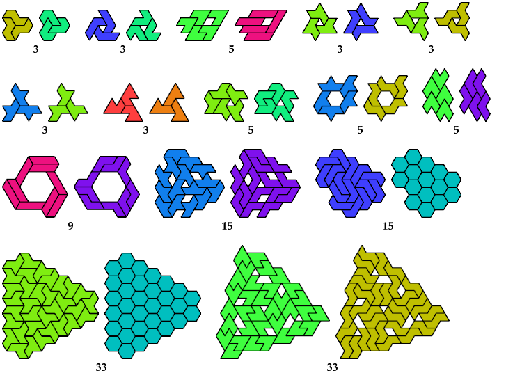This web page and my other page, Mixed Polyiamond Compatibility, extend and correct the solutions in the JRM article. For sets of three hexiamonds, see Triple Hexiamonds.