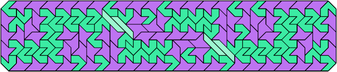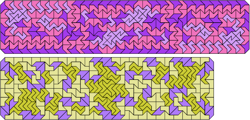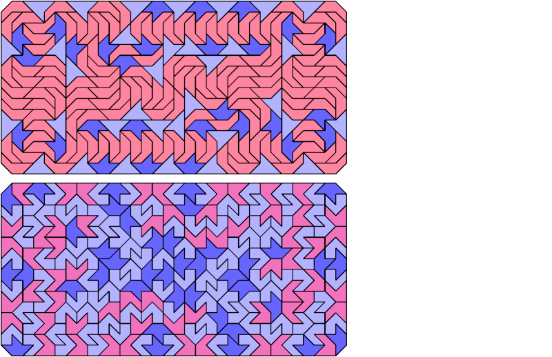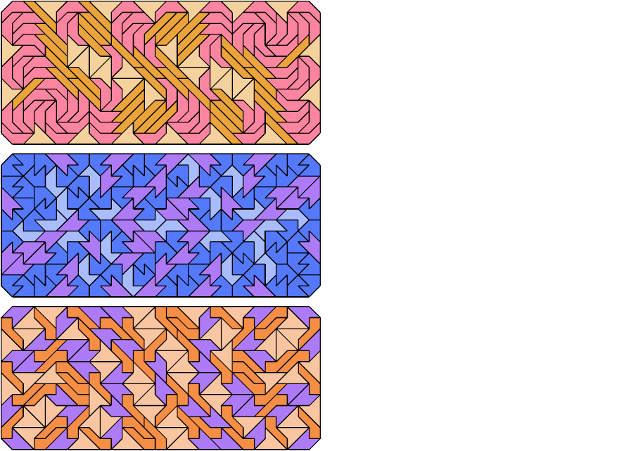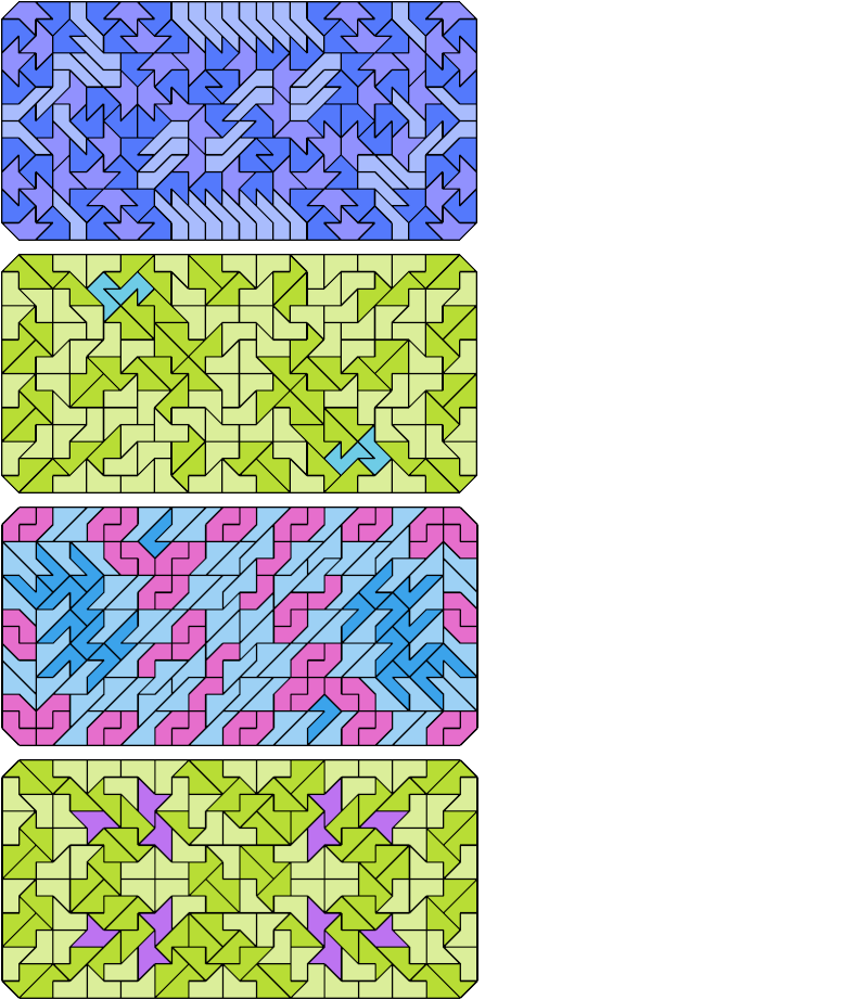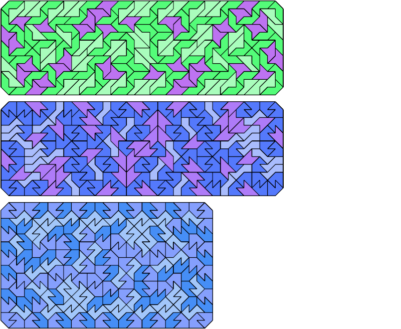 Here are chamfered rectangles tiled with copies of three different pentaboloes. There are 4,060 sets of three pentaboloes, too many to show here. Instead I show the minimal known tilings that have at least 150 tiles.
