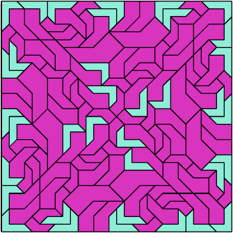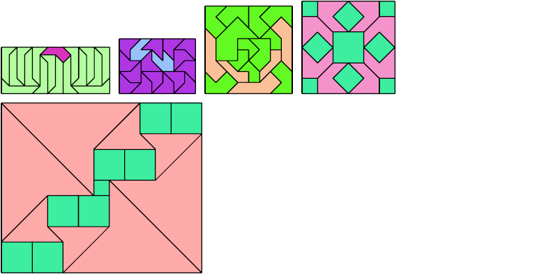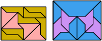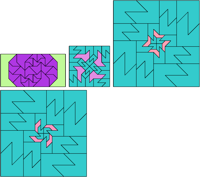 Here I show a rectangle tiled by a scaled tetrabolo and a scaled pentabolo, using at least one copy of each and as few total copies as is known to be possible. If you find a solution with fewer tiles or solve an unsolved case, please write.