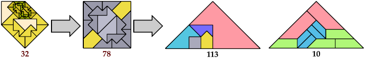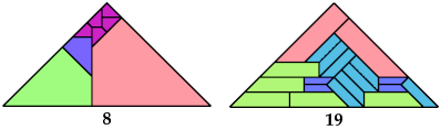 The tilings shown use as few tiles as I know how, and are not necessarily unique under this condition. If you find a tiling with fewer tiles, please write.