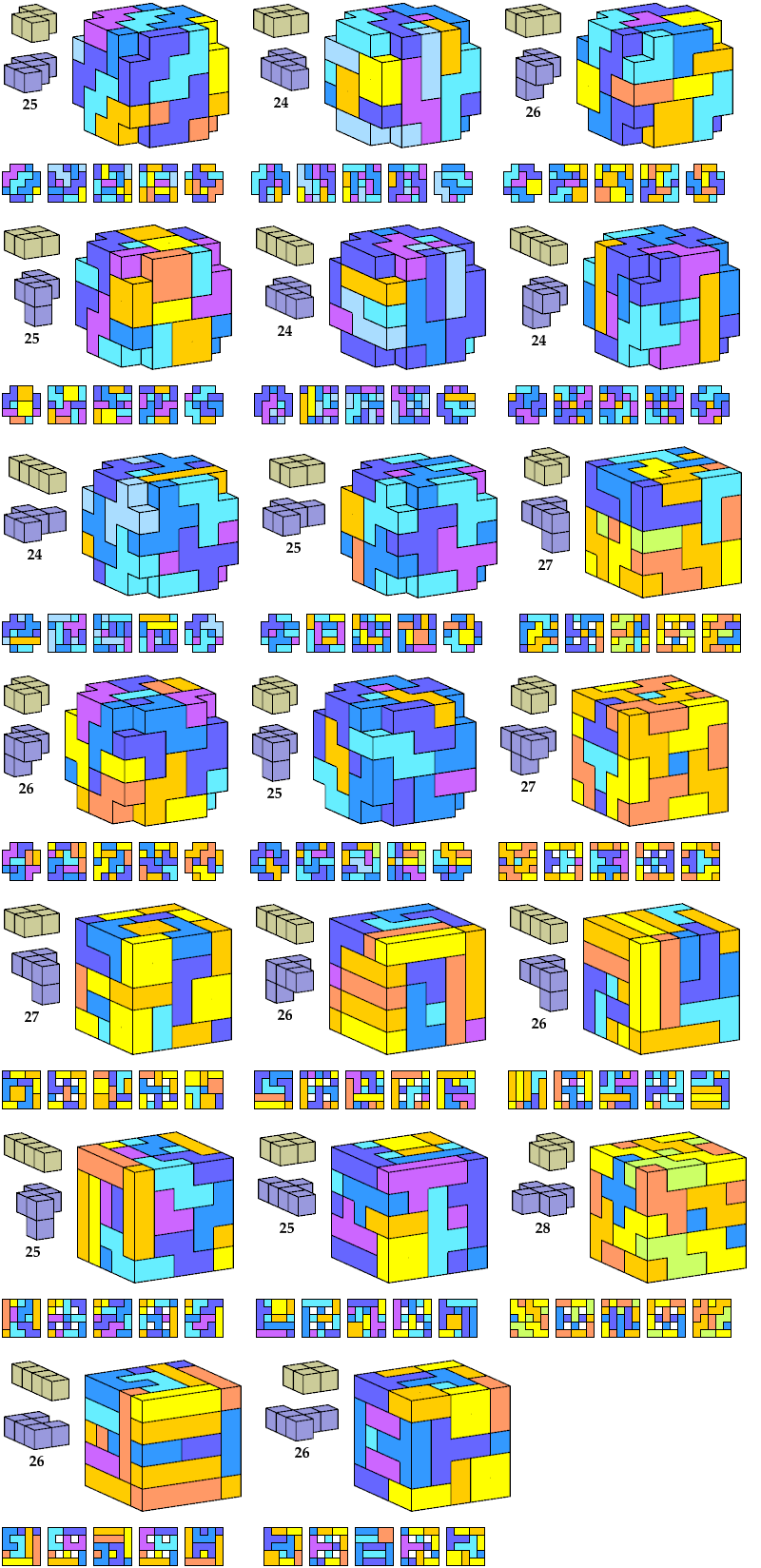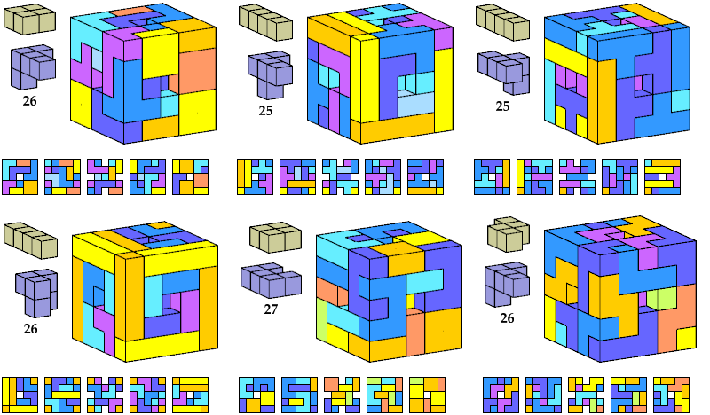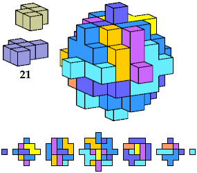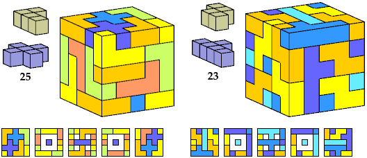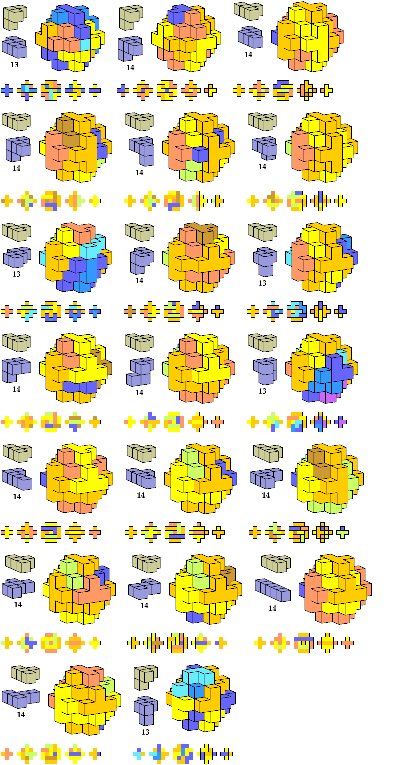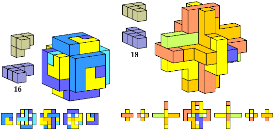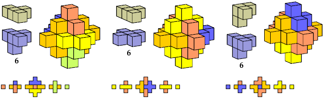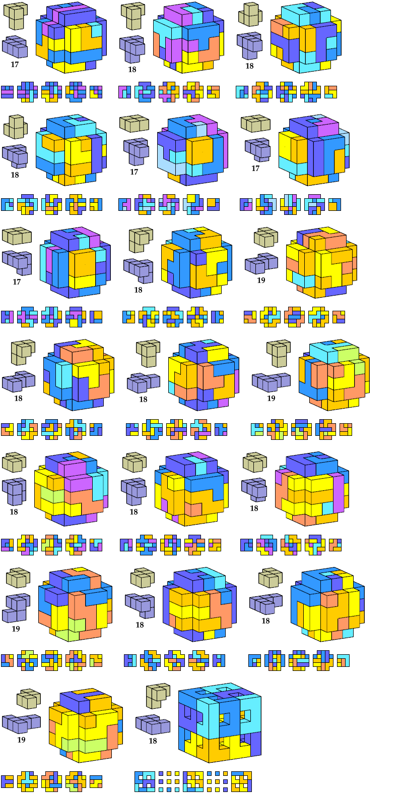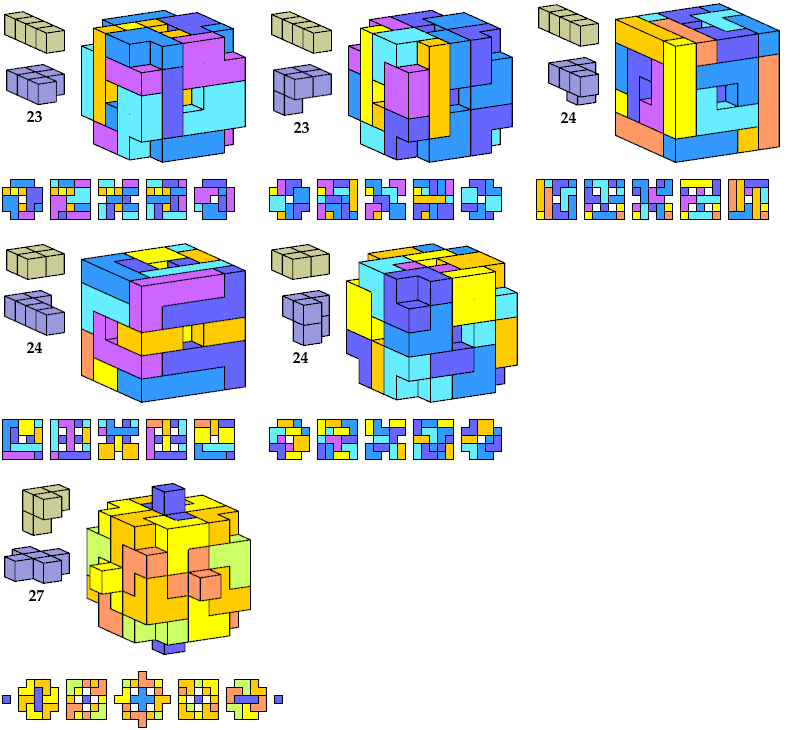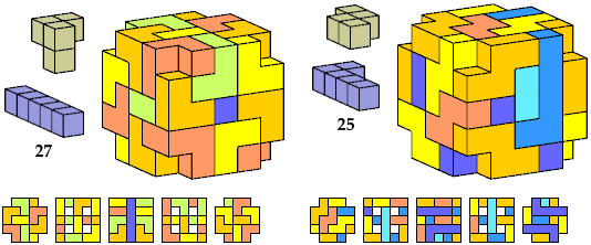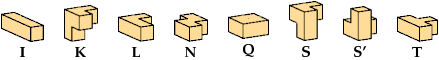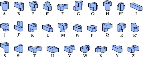 A pentacube is a solid made of 5 equal cubes joined face to face. There are 29 pentacubes, counting distinct mirror images.