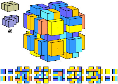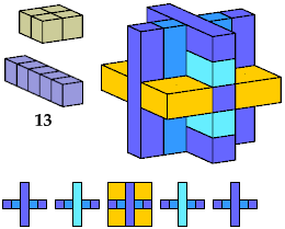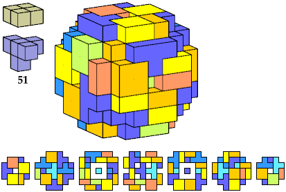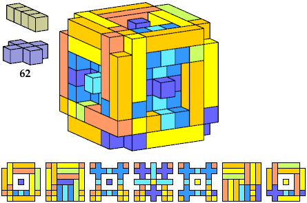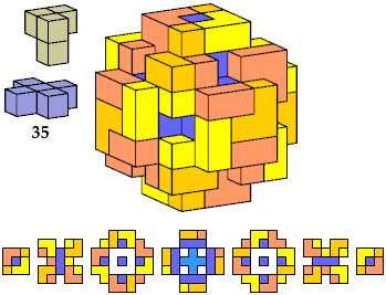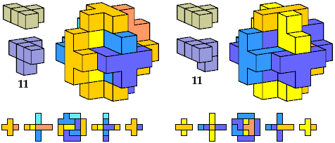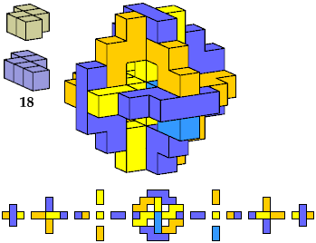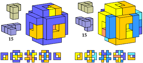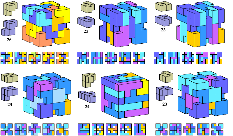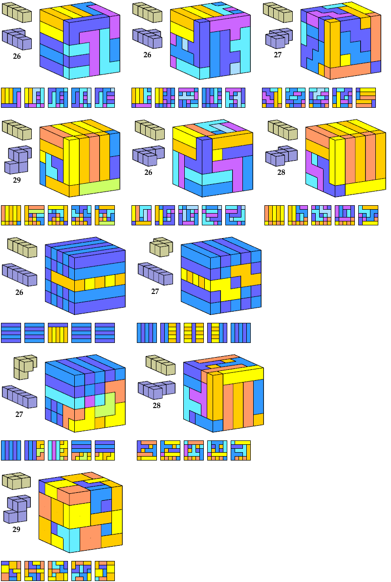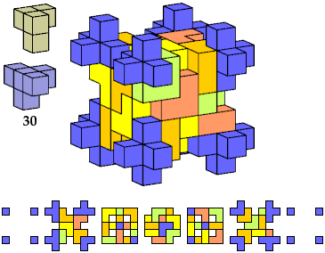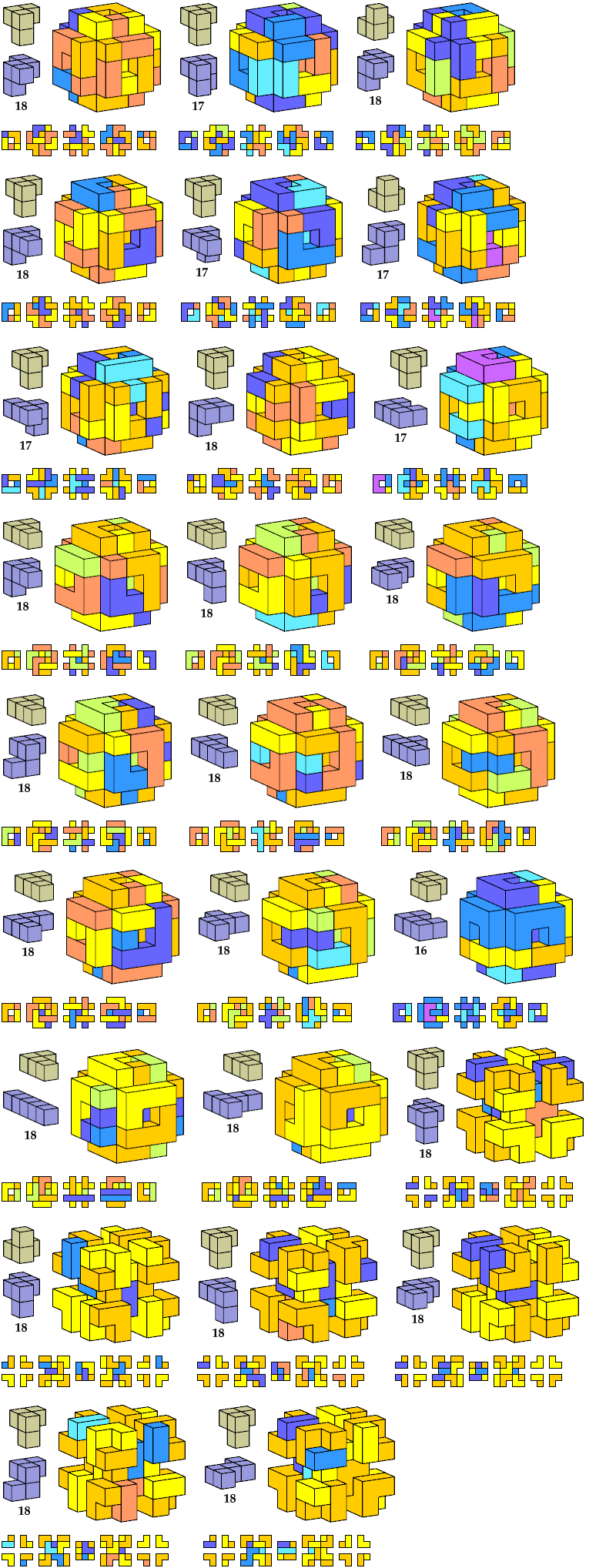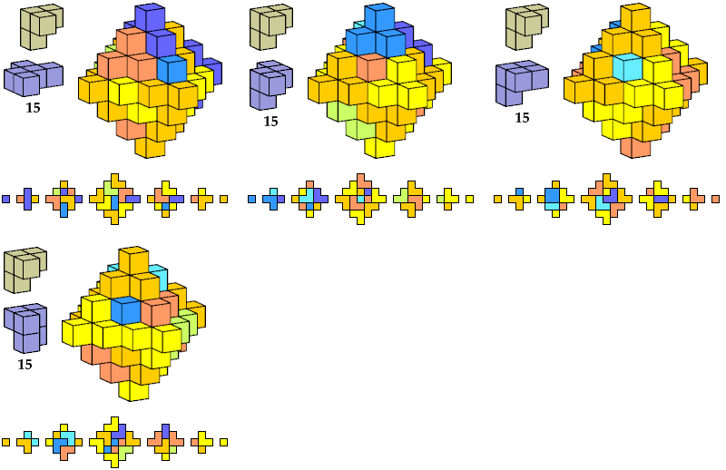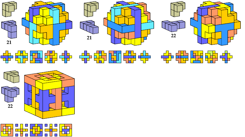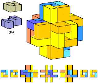 A pentacube is a solid made of 5 equal cubes joined face to face. There are 29 pentacubes, counting distinct mirror images.