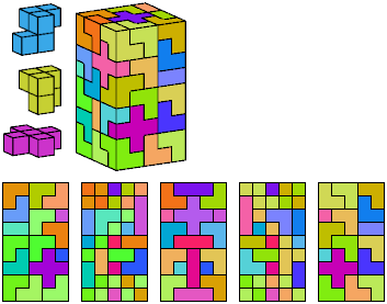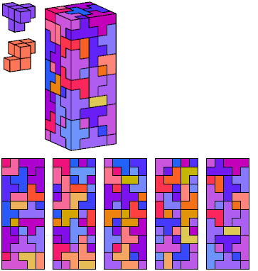 Can a rectangular prism, or box, with odd volume, be filled with copies of a pentacube? For each pentacube, here is the smallest known odd box that it can fill. Torsten Sillke's polycube box tiling page identifies many boxes besides the smallest that can be tiled by polycubes. Toshihiro Shirakawa's Box Packing Collection has extensive box tiling data for polycubes, edge-polycubes, and polyhypercubes.