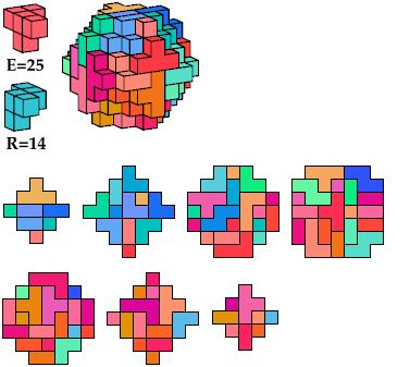 I call such cuboctal polycubes heavy, and cuboctal polycubes such as the green one above light. Heavy cuboctal polycubes must be fairly large to have their number of cells be divisible by 5. The smallest such polycube has 720 cells. The red polycube shown above has 93 cells.