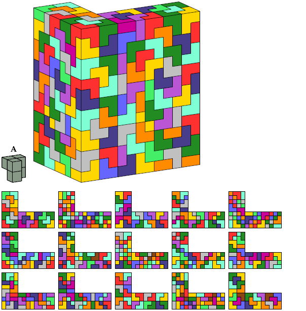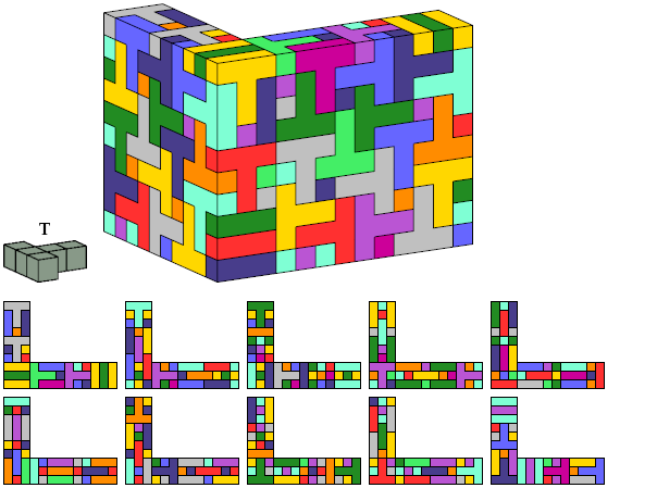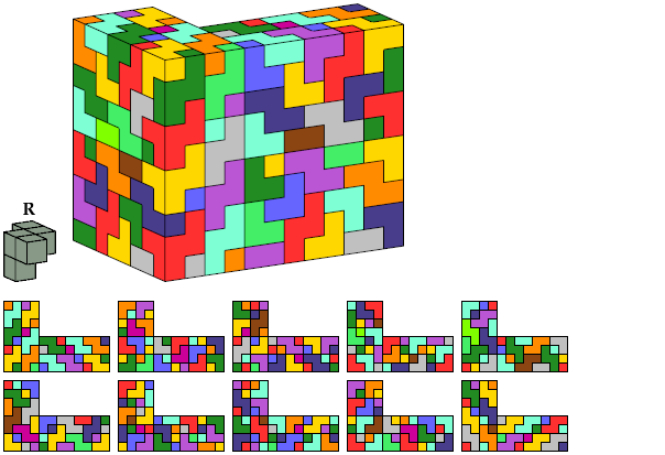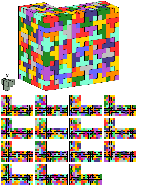 Each of the solutions shown for pentacubes T, R, A, Z, and M are formed by joining two rectangular box tilings. Smaller solutions may exist for these pentacubes.