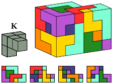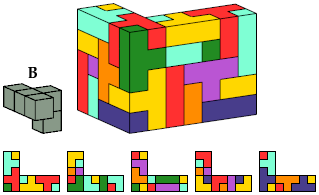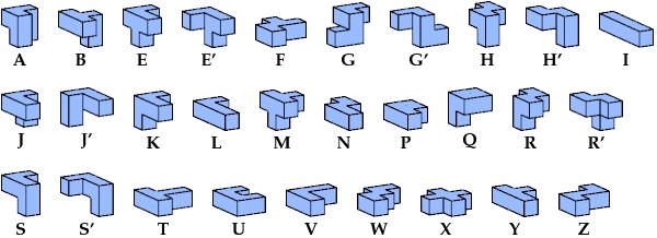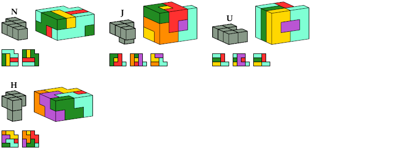 The solutions shown for pentacubes I, E, and B are formed by joining two rectangular box tilings. No smaller solutions exist for these pentacubes.