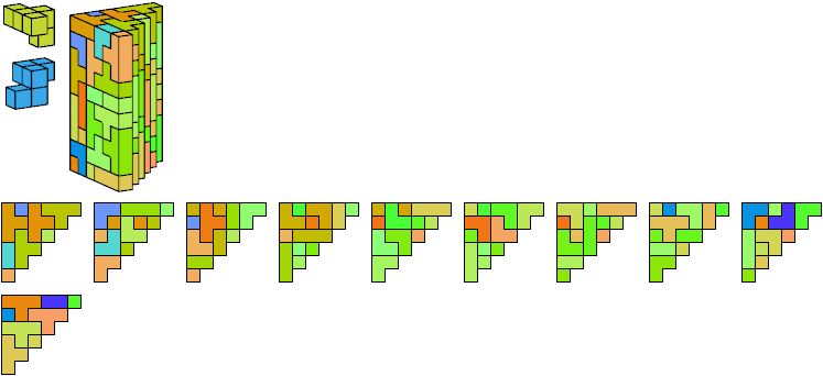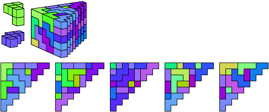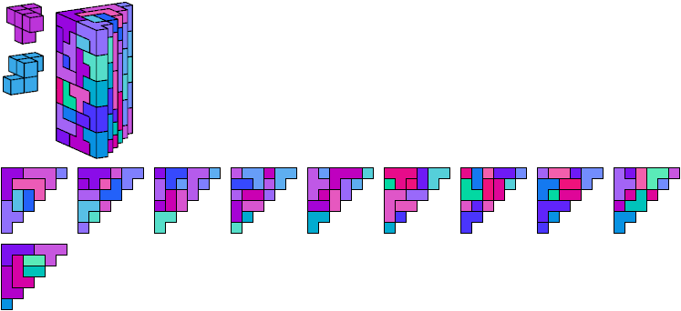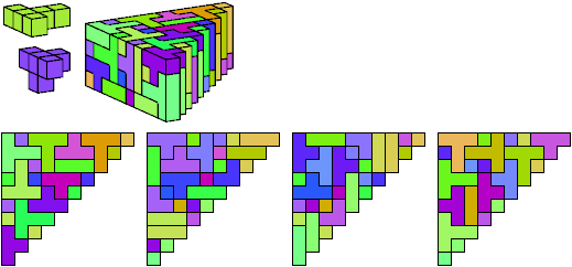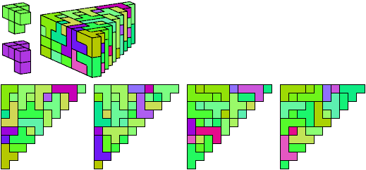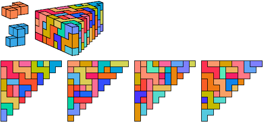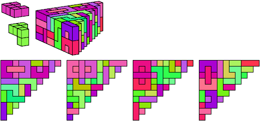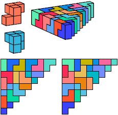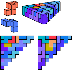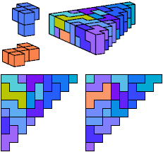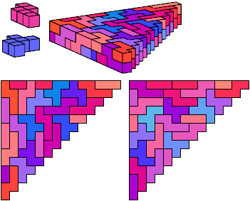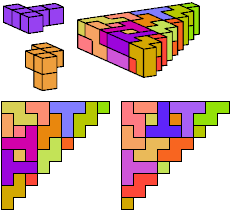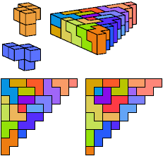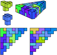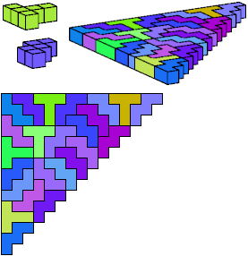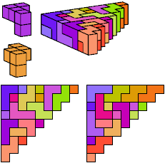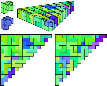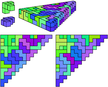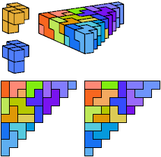 A triangle polyomino is a polyomino in the form of an isosceles right triangle. It has two straight edges and one zigzag edge that forms its hypotenuse. A triangular prism polycube is a polycube prism whose base is a triangle polyomino.