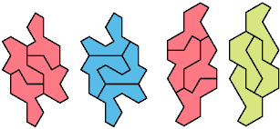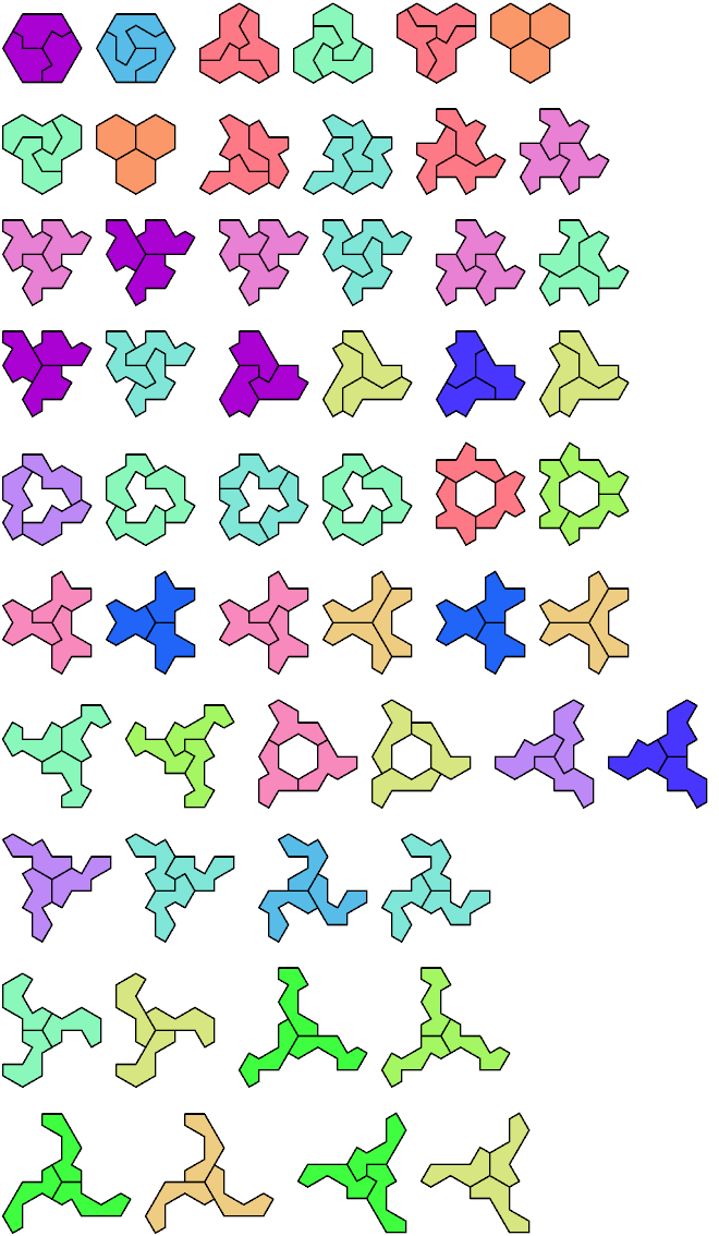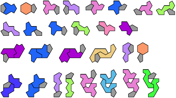 Two or more polyforms are compatible if there is a polyform that each can tile. Here are the minimal known compatibilities for trigems. Most were found by Abaroth. Please write if you find a smaller solution or solve an unsolved case.