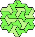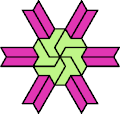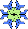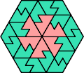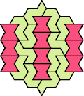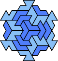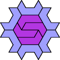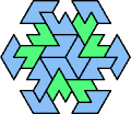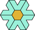 Here I show the smallest polyiamond with full symmetry and no holes that can be tiled by a hexiamond and a heptiamond, using at least one copy of each. The solutions shown are not necessarily uniquely minimal.