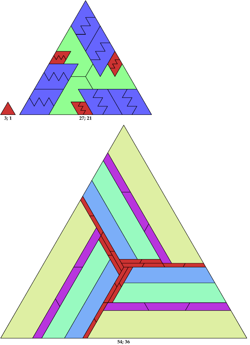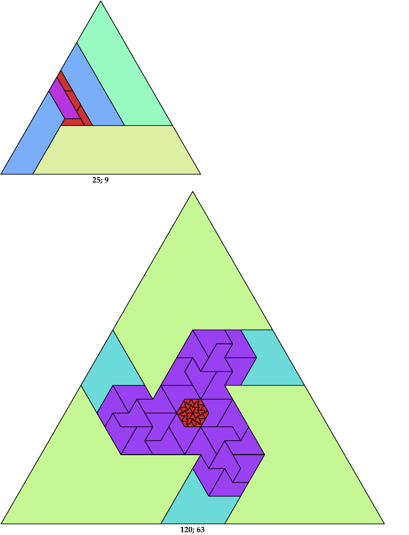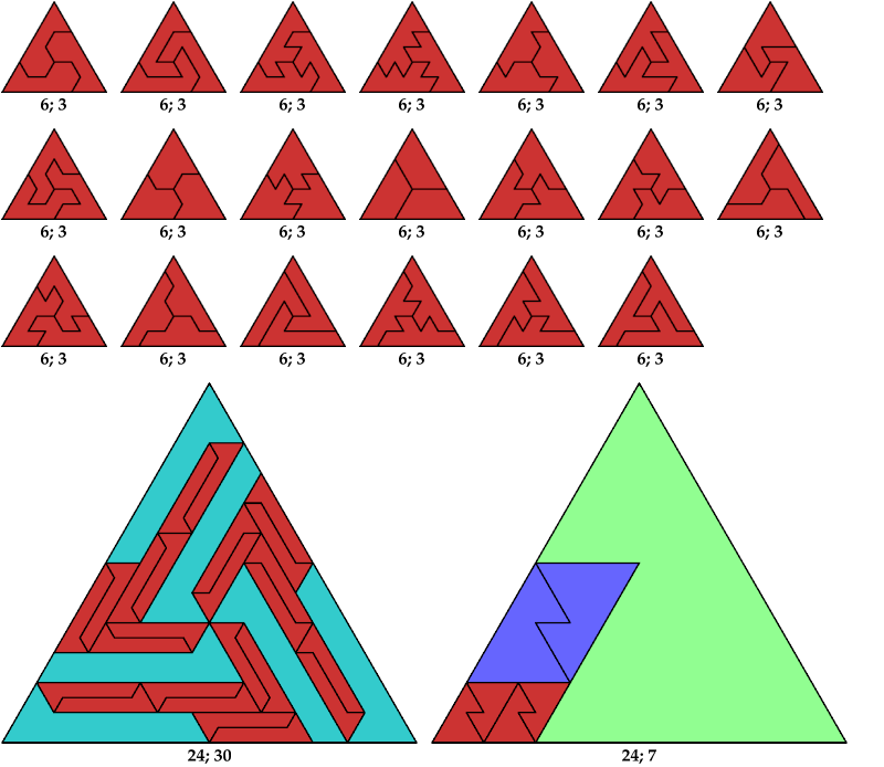 Here I show the solution with the fewest known tiles for each polyiamond. In the figures below, the numbers are the side of the triangle and the number of tiles used.