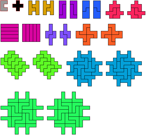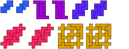 Most of the pentomino Galvagni and Reid figures were found by Erich Friedman of Stetson University and Michael Reid of the University of Central Florida. Corey Plover found the minimal Galvagni figure for the T pentomino.