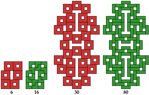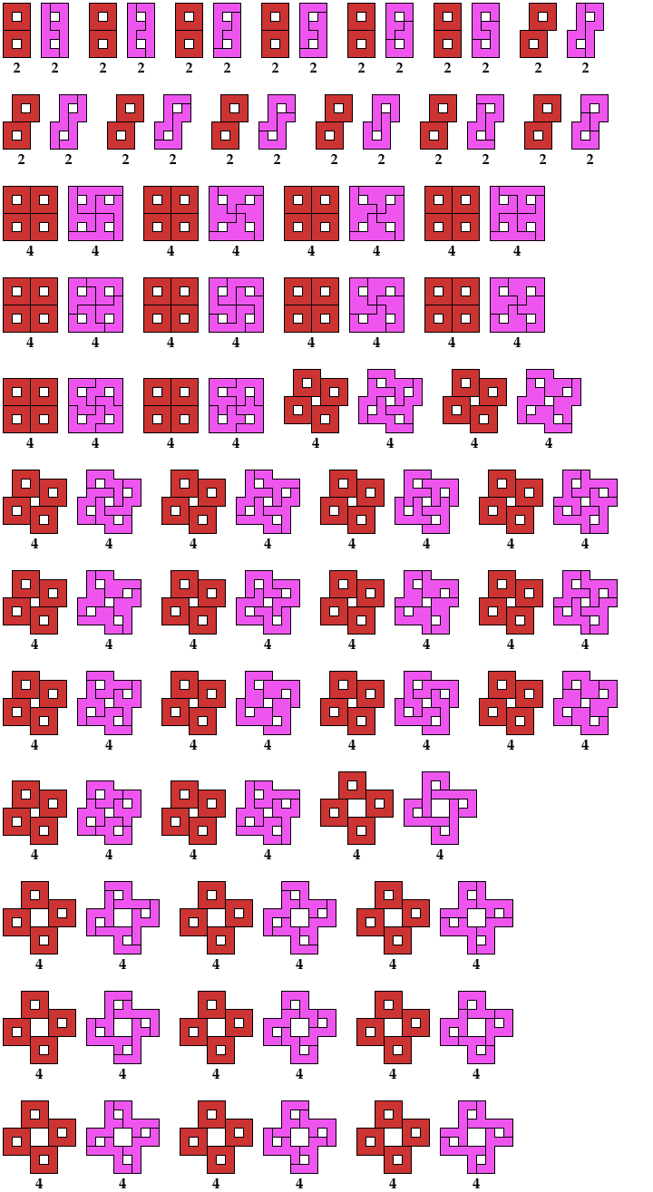 All but one of the solutions for trominoes, tetrominoes, and pentominoes were found by Giovanni Resta and can be seen at his monumental website Polypolyominoes.