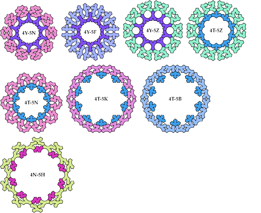 A Baiocchi figure is a figure formed by joining copies of a polyform and having the maximal symmetry for the polyform's class. For polypents, that means the symmetry of a regular decagon, or 10-way rotary with reflection.