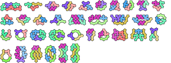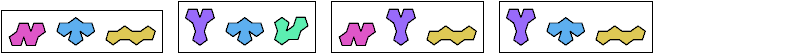 Oddities can also be constructed from sets of different shapes. Here are the minimal known oddities for triplets of tetrapents, using at least one copy of each tetrapent. Please write if you find a smaller solution or solve an unsolved case.