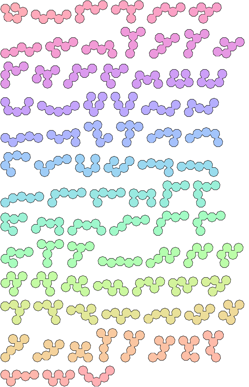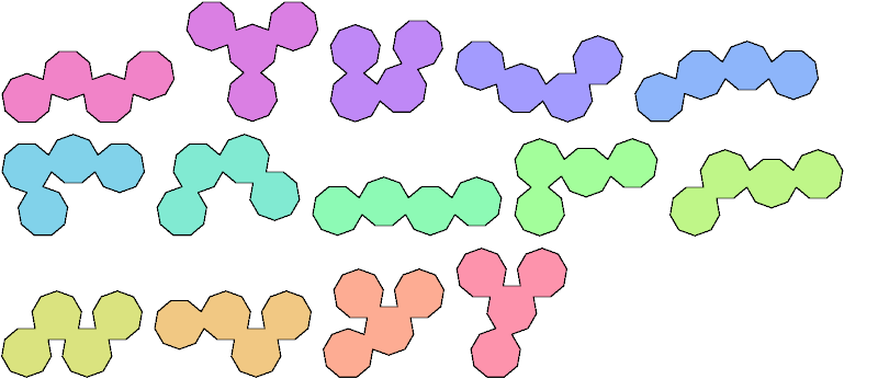 A polyenn is a figure made of regular enneagons (9-gons) joined edge to edge. Here I show all the polyenns with up to 5 cells.