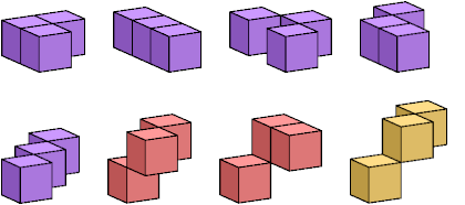 Here I show all polykedges with at most 4 cells. Like polycubes, polykedges may be one-sided or two-sided. One-sided means that distinct mirror images are counted as different polykedges. Two-sided means that distinct mirror images are counted as the same polykedge.