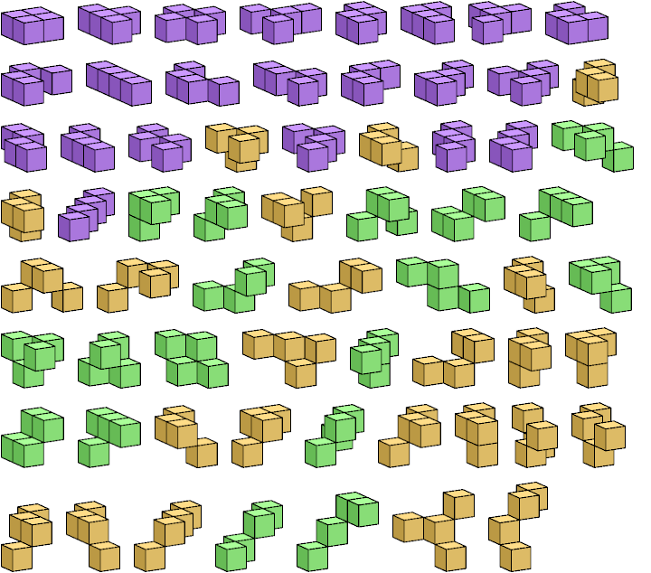 The diagrams below show two-sided polykedges. Flat polykedges are shown in purple; these are the solid polykings. Polykedges with distinct mirror images are shown in yellow; these are the chiral polykedges.