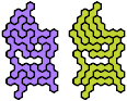 Dr. Erich Friedman's Math Magic for September 2004 shows compatibility figures for pairs of pentahexes (and many other polyforms). Here are minimal known compatibility figures for pairs of pentahexes. Joe DeVincentis and Dr. Friedman found many solutions. Dr. Andrejs Cibulis was the first to solve some of the hardest compatibilities.