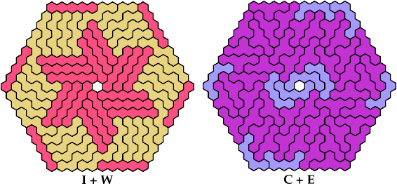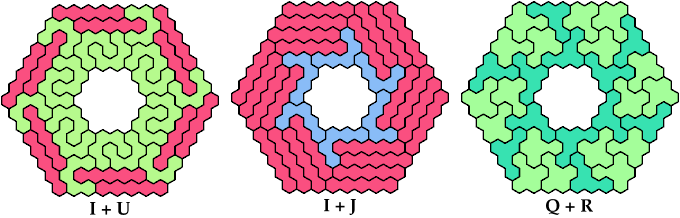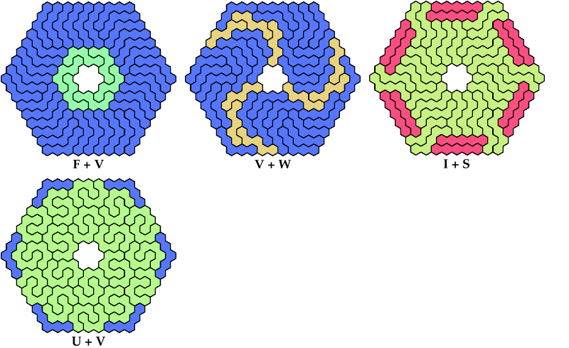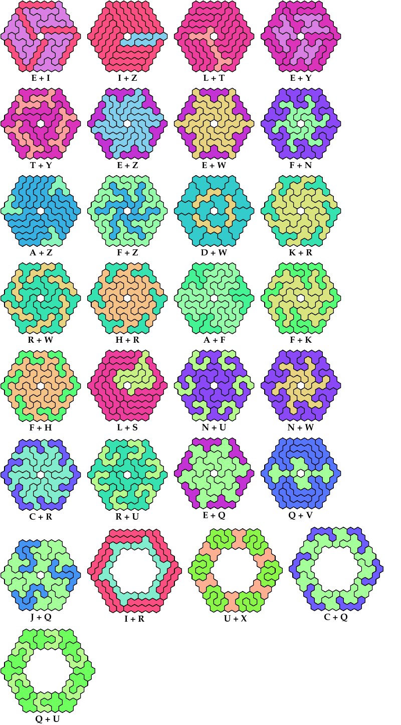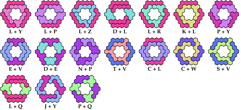 On this page, for each pair of pentahexes, I show a frame tiling with the fewest known cells, using at least one copy of each pentahex of the pair. If you find a smaller solution or solve an unsolved case, please write.