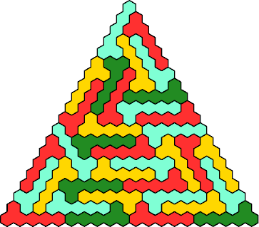 Here I show the smallest triangular polyhex of each type that various small polyhexes can tile, and identify what larger triangles they can tile. Polyhexes not shown cannot tile a triangular polyhex, so far as is known. If you find a smaller solution, or a solution for another polyhex, please write.