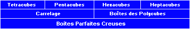 Enfin sont ici quelques constructions faits avec les 35 hexaminos solides. Pas de boîte est possible de la même preuve du coloris appliqué au hexaminos plats. La construction derniere contient le maximum compte de trous internes qui peut être placé.
