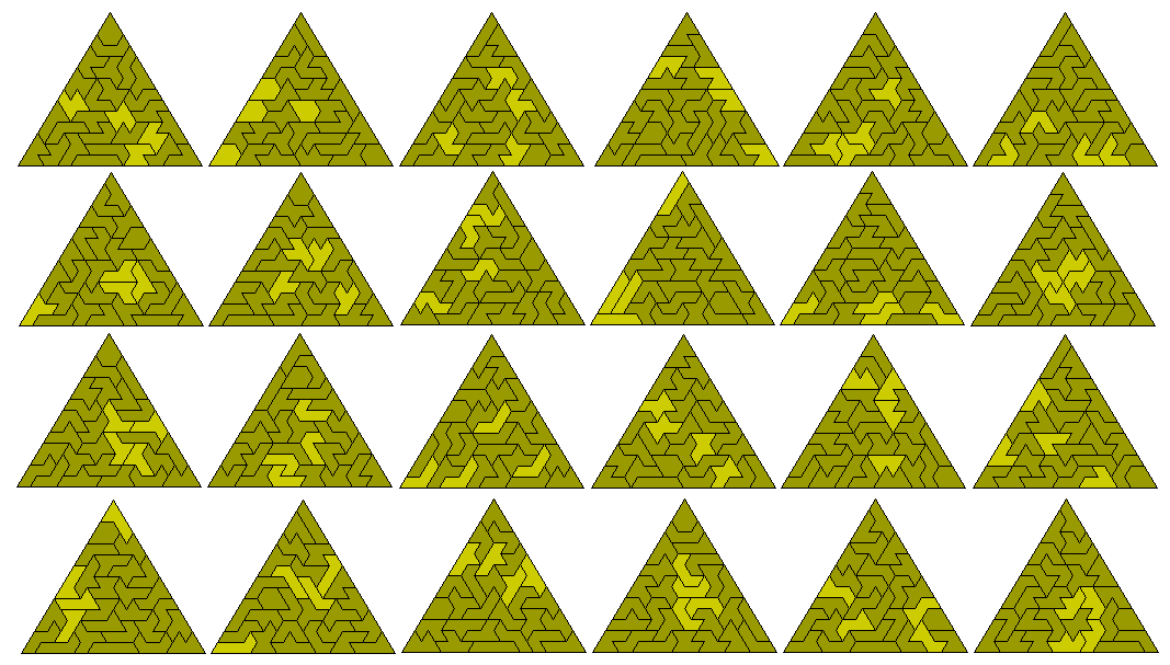 With the heptiamonds there will be many ways to form paralleograms with extra copies of one of the pieces and here we look only at forming triangles. If we added four extra copies of a piece then a side fourteen triangle can be made in all 24 cases.