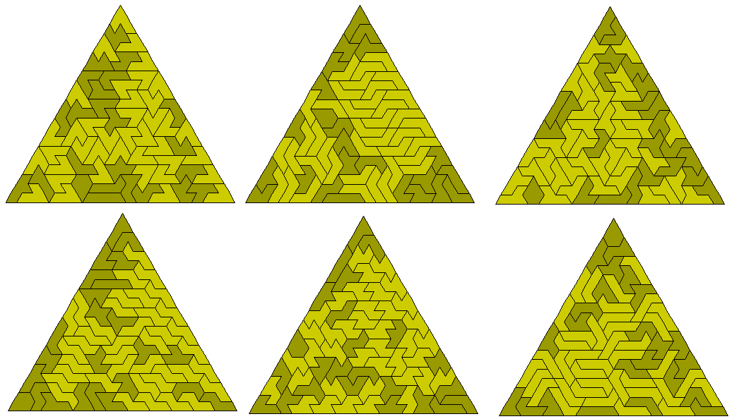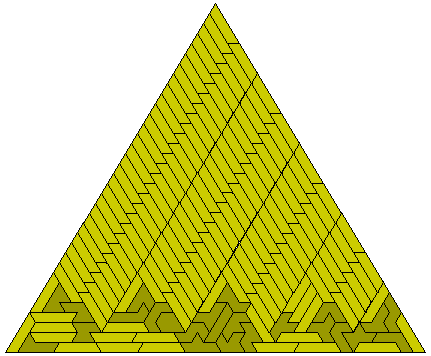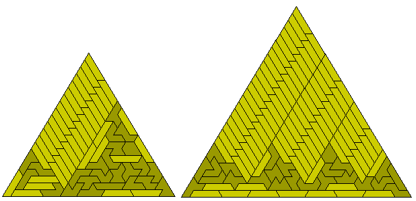 Larger triangles (sides 21 and 28) are possible with at least one of the pieces. The lower diagram shows a side 35 triangle.