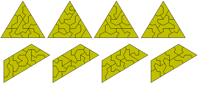 If we try dividing each triangle of a polyiamond in two then we tend to get some very complex pieces but if we include the restriction that each cut be the same on both sides of a join then we produce pieces such as those below derived from the tetriamonds, pentiamonds and hexiamonds.