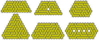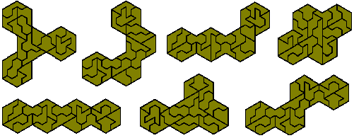 The hexagon above is a sixfold replica of an hexiamond and Brendan has produce the following pairs of figures which can be used to make replicas of all twelve hexiamonds.