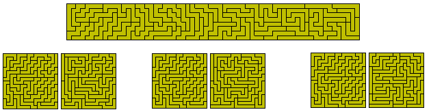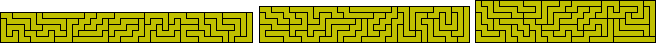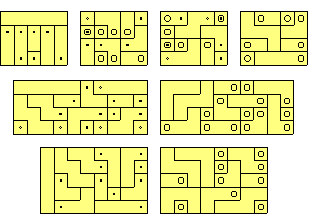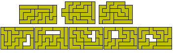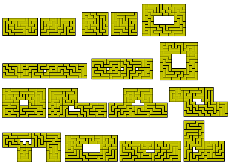 Miroslav Vicher has introduced the concept of strip polyforms which are subsets of the standard polyforms. A strip polyform is a singly connected set of squares. As an example of these sets below is shown some constructions with the 13 strip-hexominoes and a variety of rectangles made with the 30 strip-heptominoes. The figure at the top right shows a 9x10 rectangle with 12 internal holes.