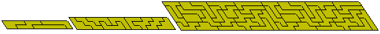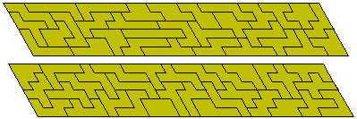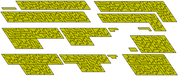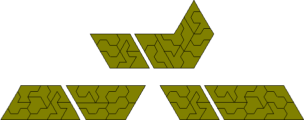 Various different types of polyforms have been suggested and studied and a variety of these is discussed in this page. Because, in order to produce a polyform, it is usually necessary to start with one of the three regular tiling patterns (squares, equilateral triangles or hexagons) most of these are either subsets or derivations of the main polyforms - polyominoes, polyiamonds and polyhexes. Some of these and others are discussed in Miroslav Vicher's site. Kate Jones' Rhombiominoes are also in this category (more information on these is available at Pentomino hungarIQa where they seem to have been rediscovered). Brendan Owen has made two 6x31 parallelogram with the 62 pieces made with six rhombi.