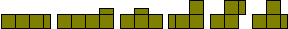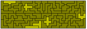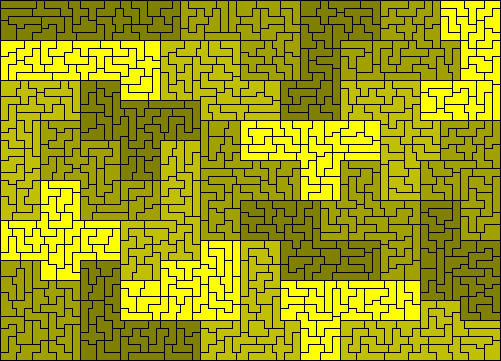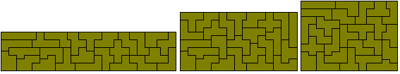 The 35 one-sided pieces shown below can also form rectangles. At least some of 2½ x 63, 3½ x 45, 4½ x 35, 5 x 31½, 7 x 22½, 7½ x 21, 9 x 17½ and 10½ x 15 are possible (the first two are not possible). The first two solutions are by Peter Esser and the three colour version of the 5 x 31½ is by Patrick Hamlyn. Peter Esser has a page on his website devoted to the one-sided truncated pentominoes.